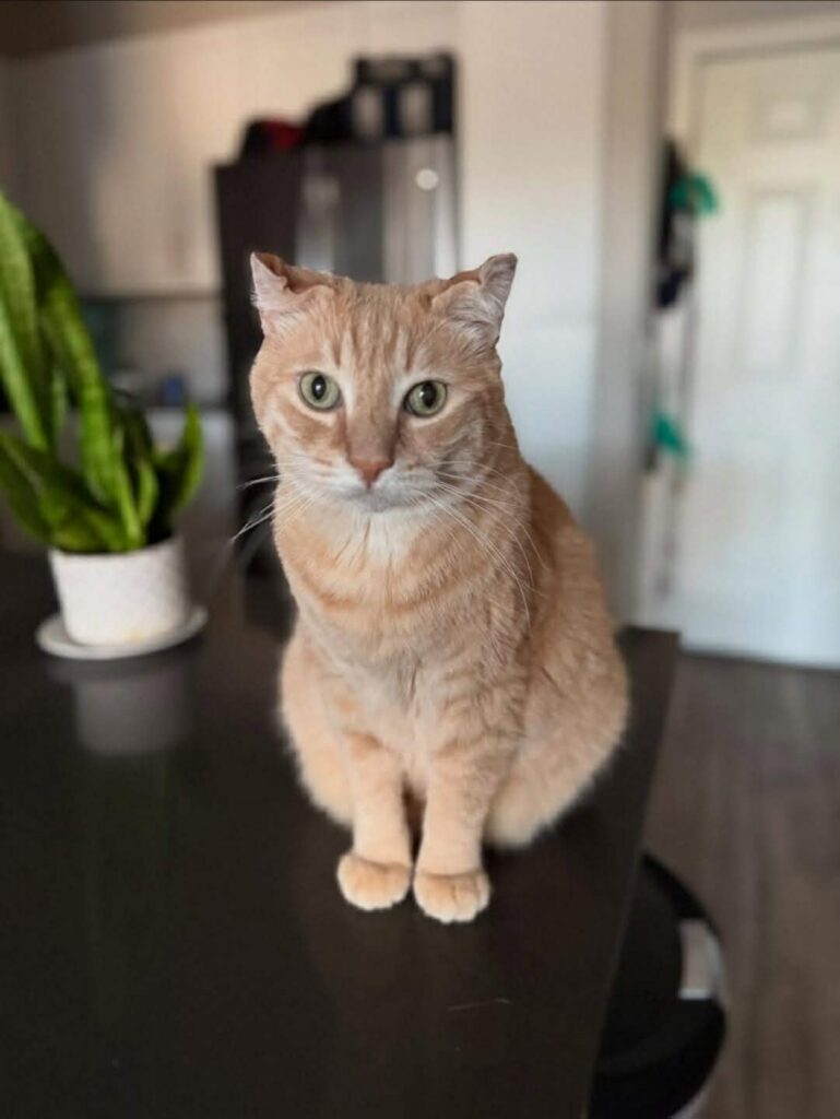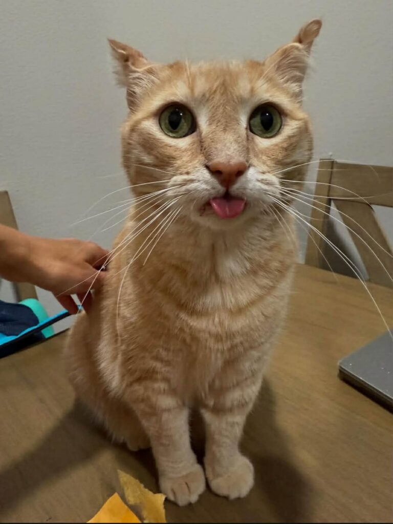 He was protective too. If anyone came near me, he would look at them like, “Are you here to love her or ruin her life? Choose carefully.” He had a cute face, a loving personality, and the comedic timing of a seasoned stand-up. He was a character. He loved food. This cat treated mealtime like it was an Olympic sport. If there were a gold medal for hearing a treat bag from three rooms away, Swissy would have been on the podium with the national anthem playing.